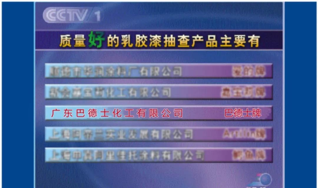 早在2003年7月国家质监总局组织的产品抽查中,巴德士内墙涂料就被评为优等品,并在2003年11月3日中央电视台“新闻三十分”栏目中被特别表扬。并于2003-2008年间,在国家质监局的多次抽查中,巴德士木器涂料、内墙涂料5年6次荣登优质产品榜。在24年的发展历程中,屡屡通过国家及地区权威检验,多次获推为消费者信得过绿色产品、3.15优质环保产品、国家免检产品等。