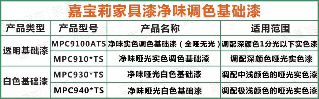 聚焦以上问题与市场需求,嘉宝莉家具漆开发了全新的净味调色基础漆产品体系,包括透明基础漆和白色基础漆,共4个产品,既可调配浅颜色、中浅颜色,也能调配深颜色。