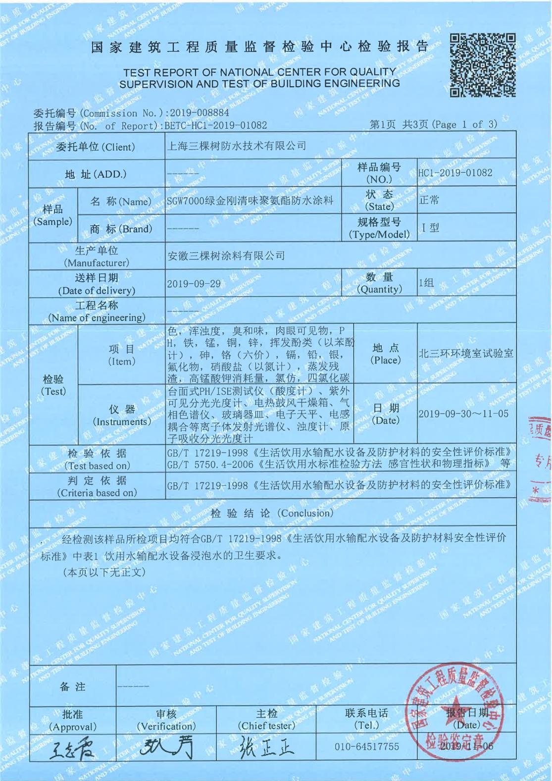 三棵树防水以科技创新为核心驱动力,深耕绿色建材理念,致力于研发“极致健康、极致性能、极致应用”的绿色产品。这款绿意清味聚氨酯防水涂料现已通过GB/T 17219 《生活饮用水输配水设备及防护材料的安全性评价标准》认证,产品在健康性及安全性方面取得了突破,赢得权威认可。