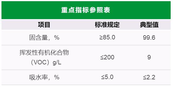 该产品开罐气味极低,可在密闭环境中使用。VOC含量仅有国标的1/20,苯及苯系物、有害重金属、游离TDI等物质均未检出。吸水率低至国标1/2,耐外界水质腐蚀,可长期浸水。固含量高达99.6%,涂布率高。