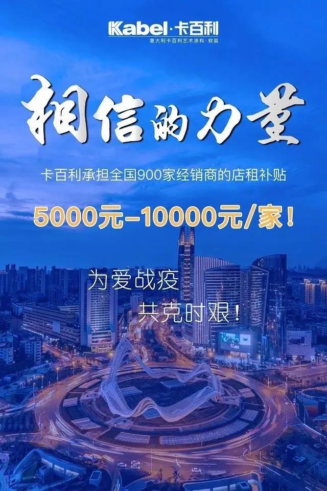 在此次疫情中,自2月6日卡百利发出一封情深意切的“家书”,宣布主动承担全国900家经销商的店租补贴(5000元—10000元/家)1个月以来,卡百利更是频频出手进行“帮扶”经销商行动,在此次抗击疫情中的表现堪称典范。