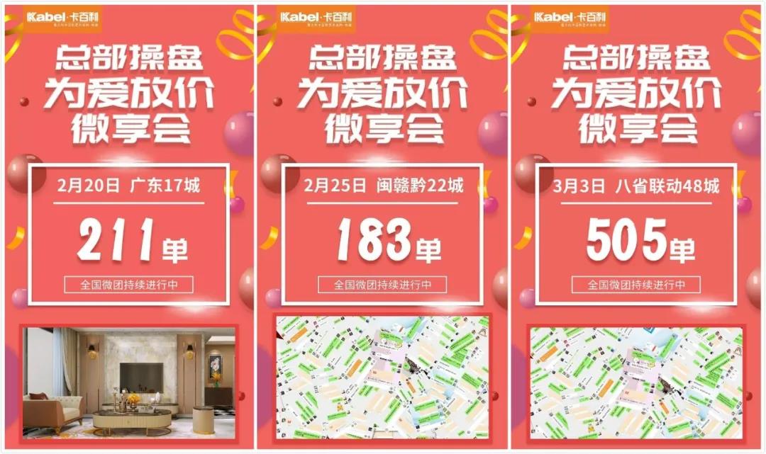 根据卡百利公开数据显示,2月20日,卡百利微信爆破广东区域,成交211单;2月25日,闽赣黔三省联动活动,成交183单;3月3日,川渝云贵湘苏鲁蒙八省联动,成交505单,其中单店最高41单。目前全国微信爆破活动还在持续进行中,将会有更多省份联合行动。