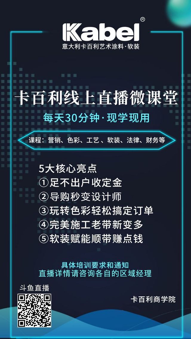 卡百利商学院相关负责人表示,卡百利“线上直播微课堂”师资力量强大,培训内容涵盖方方面面,深受经销商好评,每期参与的学员人数也在持续增加。从心出发,苦练内功,我们致力于把“线上直播微课堂”打造成艺术涂料行业的“黄埔军校”。