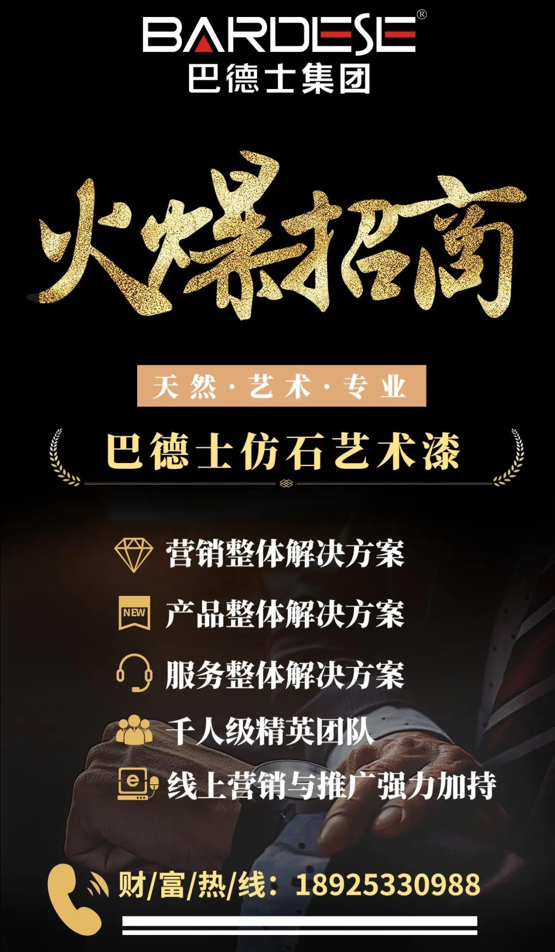在2020年集团总战略升级为“人才+管理”的大背景下,“巴德士仿石艺术漆”目前正面向全国广纳英豪、广招实力经销商,力求汇聚多方有识之士力量,共同精耕市场打天下,让“天然·艺术·专业”响彻后疫情时代!