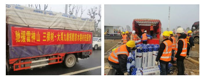 在医院筹建之初,三棵树旗下的大禹九鼎专业防水公司的员工就组建了先锋队,在了解到物资需求信息后,4小时内完成物资和车辆的紧急调配,争分夺秒连夜将物资装车、交付、卸货、铺设。不到一天时间就铺设成功,助力于医院建设快速投入使用。
