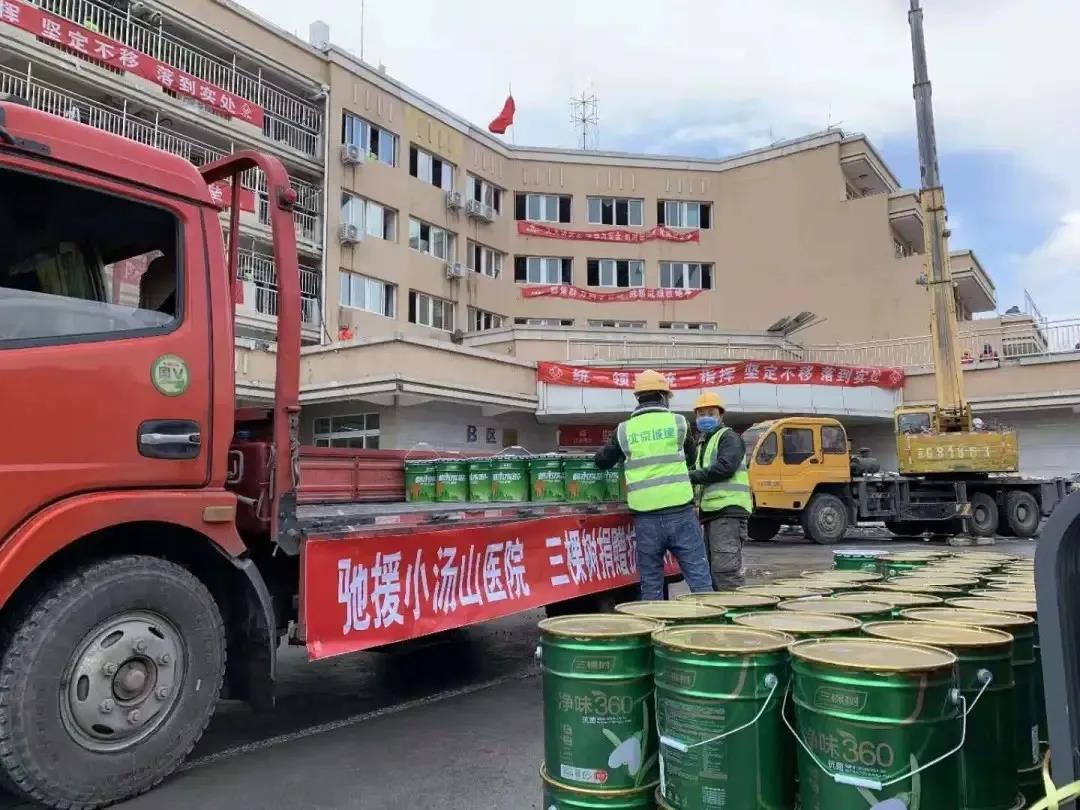 三棵树北京大客户团队及天津工厂组成抗疫驰援先锋队,主动与小汤山医院总指挥部取得联系,一批健康内墙涂料驰援物资运达小汤山医院。在施工期间,三棵树应急小组还全天候现场查勘、给出书面施工指导。