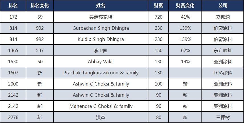 据《涂料经》观察,本次胡润全球富豪榜共有9位涂料人及1位防水人物上榜,他们分别是:立邦涂料的吴清亮家族;伯爵涂料的Gurbachan Singh Dhingra、Kuldip Singh Dhingra;东方雨虹的李卫国;亚洲涂料的Abhay Vakil、Ashwin C Choksi & family、Ashwin C Choksi & family、Mahendra C Choksi & family;TOA涂料的Prachak Tangkaravakoon & family;三棵树洪杰。他们的财富总额达1950亿元。