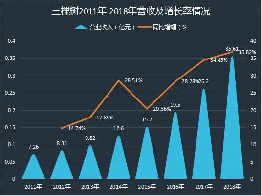 可以说,三棵树以一年一个台阶的姿态,仅仅用时七年便几乎完成了“再造四个棵树”的壮举——2018年营收规模是2011年的近4倍,相当于再造了四个三棵树。三棵树不断用实力证明其“中国民用涂料第一股”并非浪得虚名。