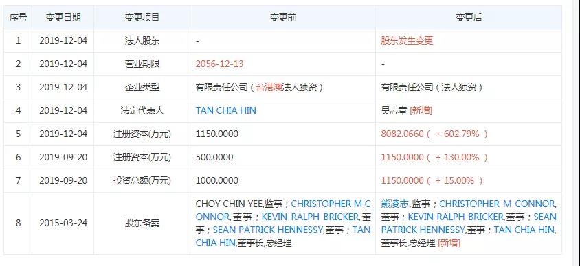 在“变更记录”一栏中,《涂料经》发现,9月20日,投资总额从1000万元增至1150万元;注册资本从500万元增至8082.066万元;12月4日,法定代表人TAN CHIA HIN变更为吴志章;企业类型有“有限责任公司(台港澳法人独资)”变更为“有限责任公司(法人独资)”,法人股东现为“广东得时宝建材科技有限公司”。所以,肇庆宣伟涂料有限公司和宣伟涂料已毫无关联。
