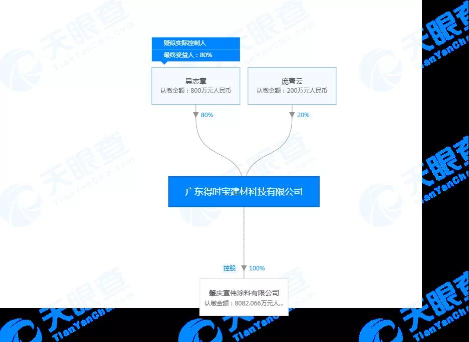 此外,根据《天眼查》得知,广东得时宝建材科技有限公司注册资本1000万人民币,属非金属矿物制品行业,成立于2017年6月16日的肇庆市高新区,法定代表人:吴志章,股东为吴志章、庞青云。经营范围为生产、研发、销售:石材幕墙贴合剂、环氧树脂粘合剂、防水涂料(不含危险化学品)。
