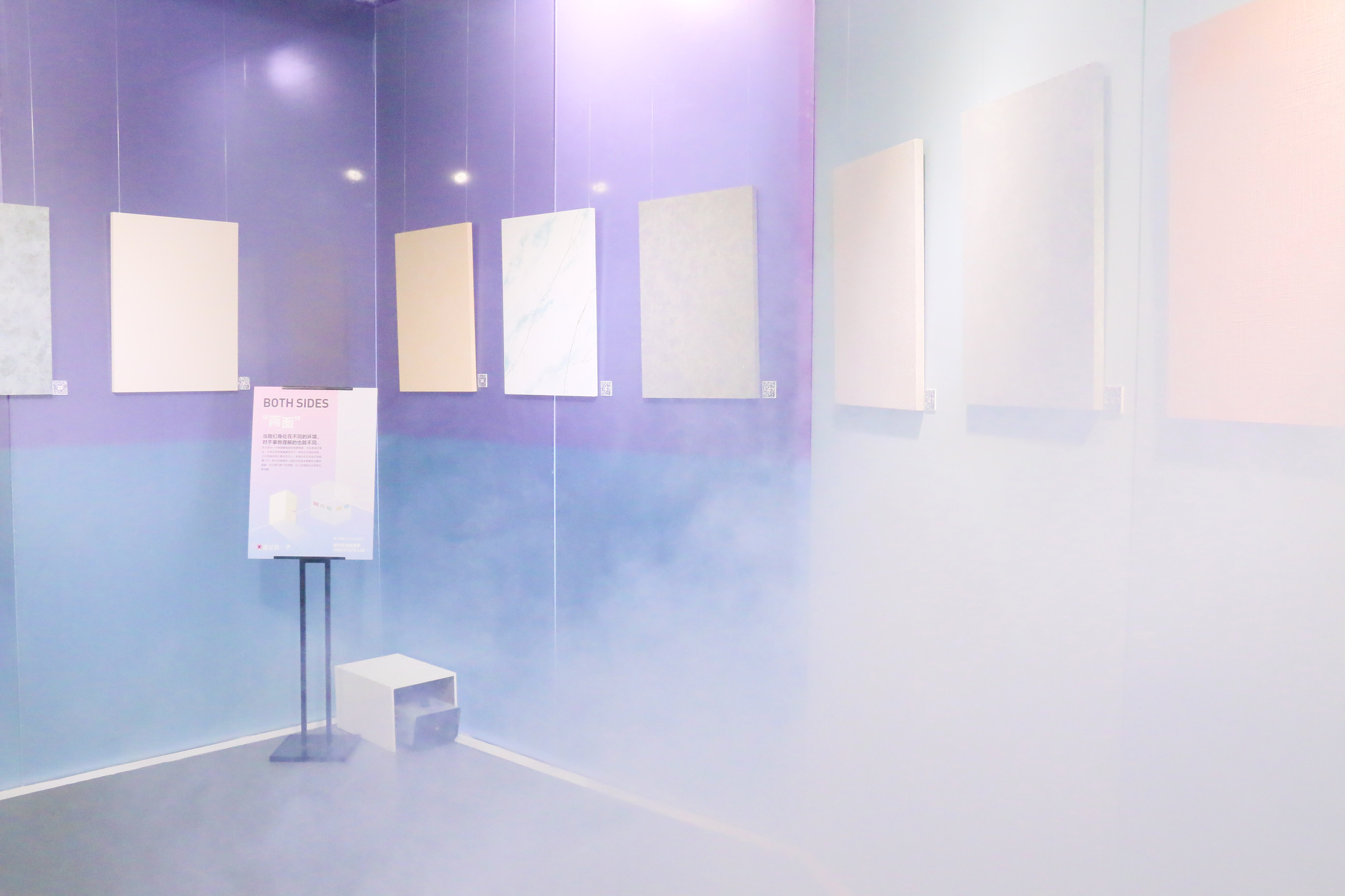 “两面”艺术装置被朦朦胧胧的烟雾掩盖,但如果凑近看去,你就会发现隐藏着很多不一样的艺术涂料样板。它们就像是我们真实的内心,被淹没在这些迷幻的烟雾之中。