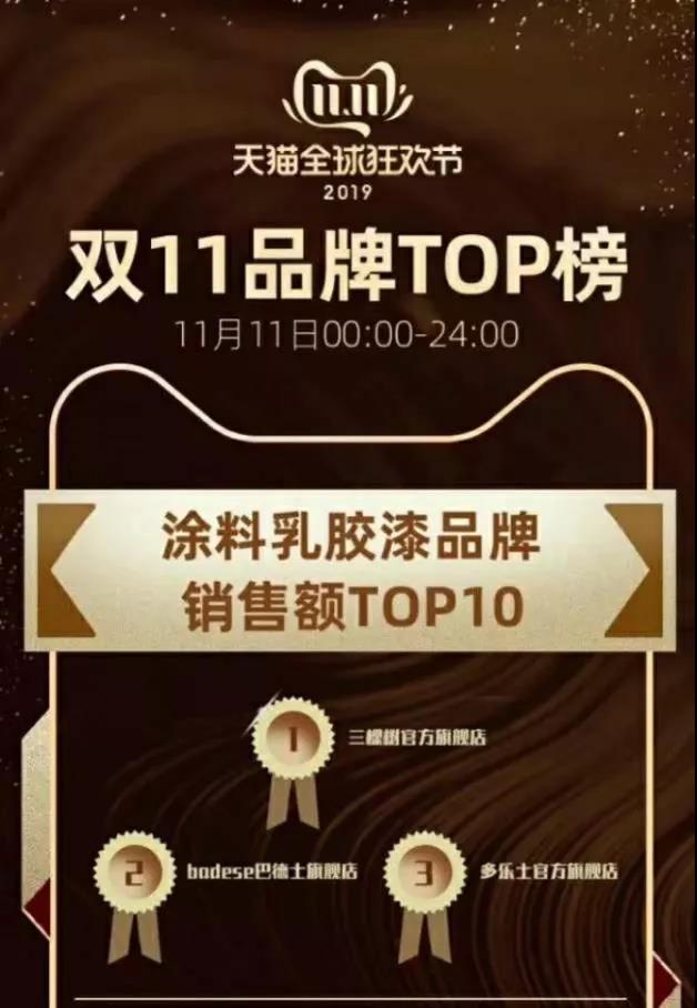 2019年11月11日,一年一度的“双11”全球购物狂欢节圆满落下帷幕。2684亿的日成交额在刷新交易记录的同时,也再次证明了中国强大的消费能力。在涂料电商方面,多个涂料品牌都有着不俗的表现,拿出了亮眼的“成绩单”。