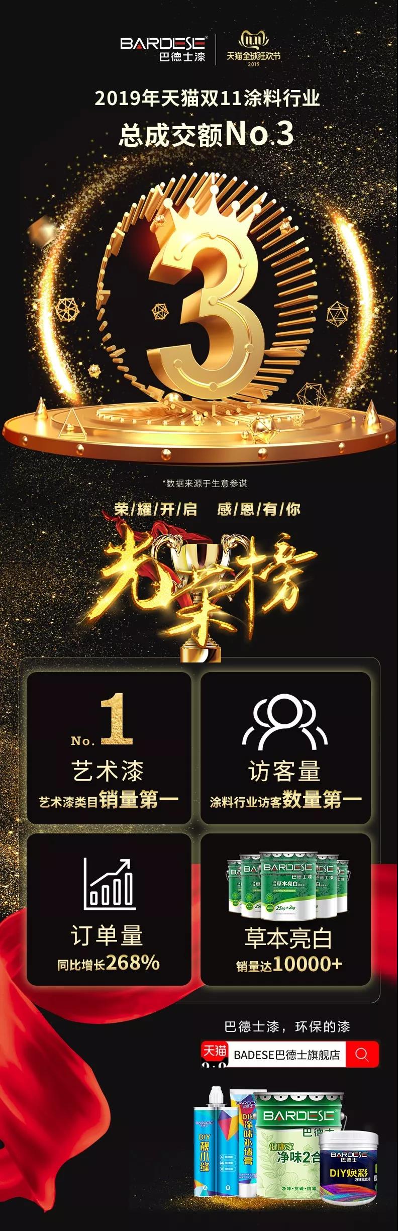 特别是巴德士,《涂料经》记者注意到,在全体员工的努力奋战下,巴德士双十一当天销售额快速上涨,订单数量也是全线飘红,在涂料类产品中夺得多项上佳成绩:天猫旗舰店在涂料乳胶漆品类销售额位居第二;巴德士漆总成交额居涂料行业第三;巴德士艺术漆在艺术漆类销量第一;涂料行业访客量行业第一;订单量同比增长268%;草木亮白产品系列销量达到10000+。