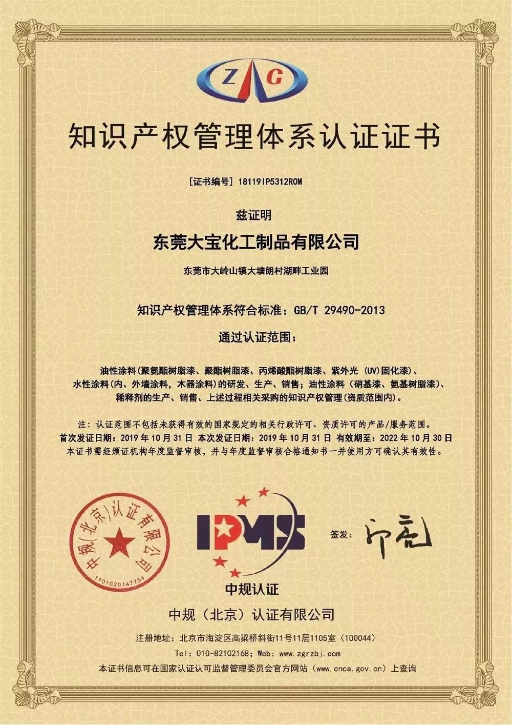 2019年10月31日,东莞大宝化工顺利通过GB/T29490-2013知识产权管理体系认证,获得中规(北京)认证有限公司颁发的认证证书。通过认证范围包括:油性涂料(聚氨酯树脂漆、聚酯树脂漆、丙烯酸酯树脂漆、紫外光(UV)固化漆)、水性涂料(内、外墙涂料,木器涂料)的研发、生产、销售;油性涂料(硝基漆、氨基树脂漆)、稀释剂的生产、销售等涉及的知识产权管理。