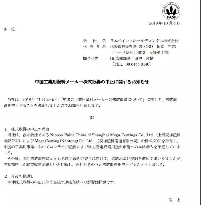 10月4日,立邦涂料母公司日本涂料控股株式会社(Nippon Paint Holdings Co.,Ltd.。简称“日涂控股”)发布了一则“关于中止收购中国工业涂料生产商”的通知,宣布立邦投资有限公司(简称“立邦中国”)已决定中止收购中国工业涂料制造商麦加涂料的多数股权。