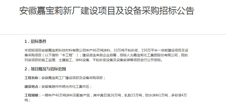 10月10日,嘉宝莉化工集团股份有限公司(简称嘉宝莉集团)发布《安徽嘉宝莉新厂建设项目及设备采购招标公告》(以下简称“招标公告”),表示其安徽嘉宝莉科技材料有限公司(简称安徽嘉宝莉)年产46万吨涂料、10万吨干粉砂浆、150万平米一体板建设项目及设备采购项目正式开始公开招标。