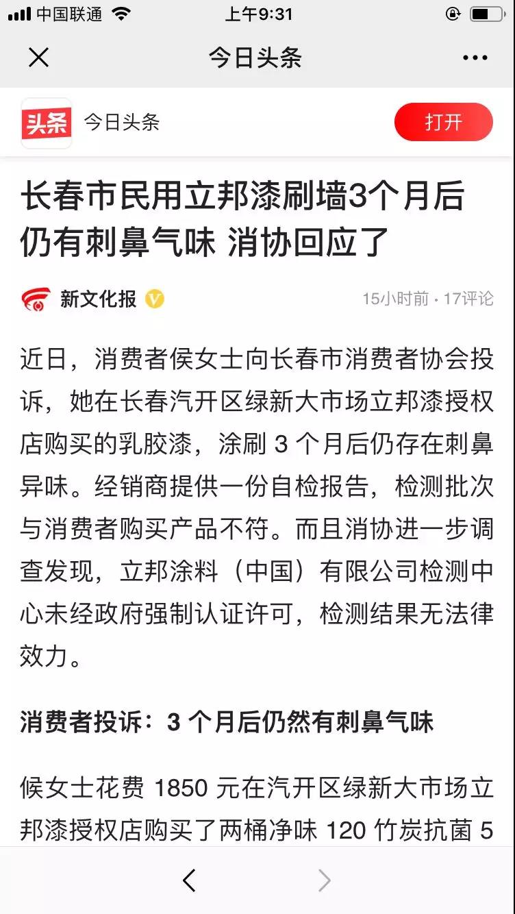 近日,消费者侯女士向长春市消费者协会投诉,她在长春汽开区绿新大市场立邦漆授权店购买的乳胶漆,涂刷 3 个月后仍存在刺鼻异味。经销商提供一份自检报告,检测批次与消费者购买产品不符。而且消协进一步调查发现,立邦涂料(中国)有限公司检测中心未经政府强制认证许可,检测结果无法律效力。