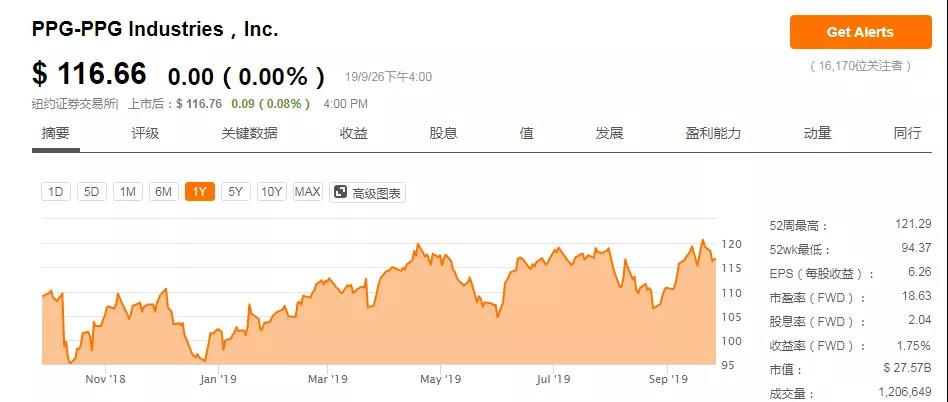 目前PPG股价为116.66美元/股,较2018年5月11日收盘价100.43美元/股上升了16.2%,逐步回升中。根据PPG披露的半年财报显示,2019年上半年实现销售额为76.48亿美元,同比下降3.45%;税前收入为7.82亿美元,同比下降15.09%;持续经营利润为5.94亿美元,同比下降19.36%;净利润为5.84亿美元,同比下降20.72%。