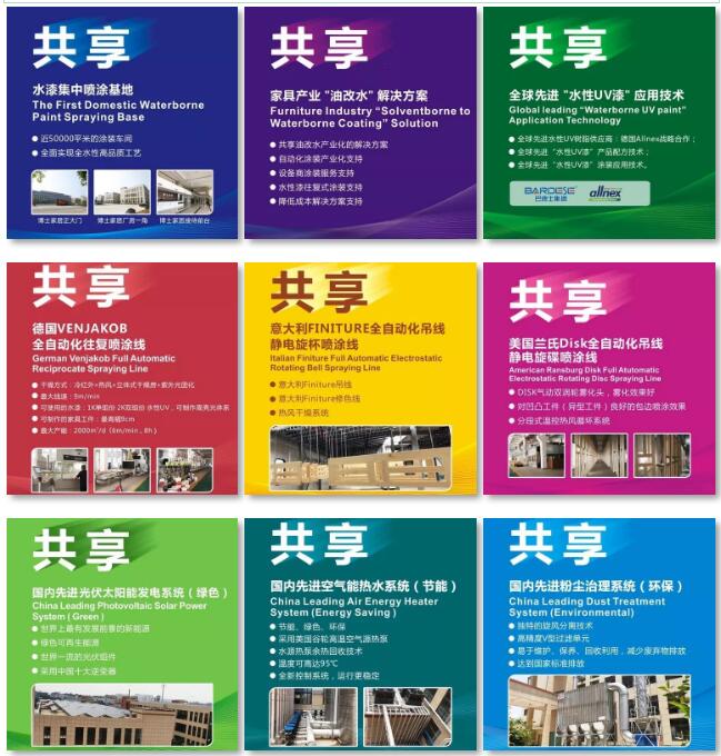 博士家居“共享水漆涂装”解决了传统家具企业“油改水”的转型难题,以及喷涂废气难处理的问题,通过“技术可共享,生产可参观,环保看得见”的全套水漆涂装模式以及“绿色环保、低碳节能,技术领先”的品牌理念,与当地家具企业抱团发展,向家具企业提供纯水漆家具涂装服务,增强南康家具品牌形象与竞争力,共享环保成果,共享水漆涂装的未来。