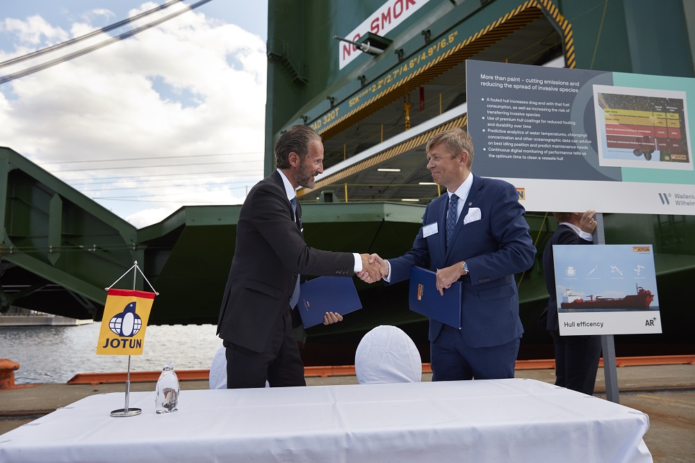 佐敦船舶涂料斯堪的纳维亚地区销售总监Ulf Skovli(左);Wallenius Wilhelmsen船舶运营高级副总裁Geir Fagerheim(右)。照片版权归Wallenius Wihelmsen所有。