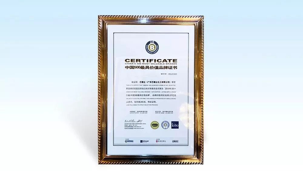 随着巴德士集团的战略布局及高速发展,其品牌实力及行业地位也随之不断攀升。2019年,巴德士集团连续6年蝉联“中国房地产开发企业500强首选供应商品牌·涂料类”荣誉;连续五年跻身中国500最具价值品牌,2019年品牌价值高达205.37亿元;问鼎2019年全球顶级涂料企业TOP42...