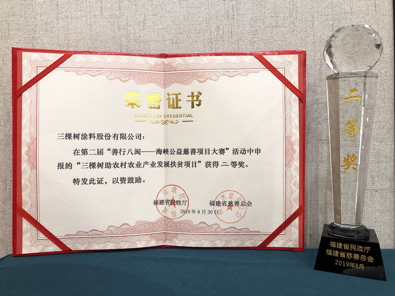8月30日,由福建省民政厅指导、福建省慈善总会主办的第二届“善行八闽——海峡公益慈善项目大赛”颁奖仪式在福州西湖宾馆举行。“三棵树助农村农业产业发展扶贫项目”荣获大赛二等奖。