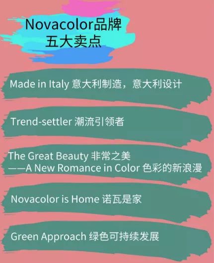 Novacolor产品均符合欧盟国家的标准,比如COLORE SICUR认证、HACCP认证、法国VOC检测A+认证等,保证了产品的质量与环保性。此外,novacolor崇尚直觉和创新,以个性化的艺术质感著称,并从1500多种颜色中挑选了136种不会过时的乳胶漆颜色,通过个性的色彩故事,充分满足新时代消费者对“个性”“美观”“时尚”“潮流”“名牌”的追求。