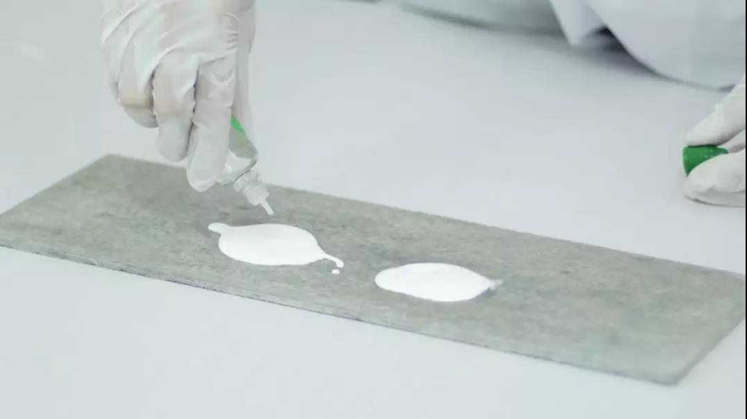 静置2分钟后,再分别滴入显色剂。45分钟后观察,普通涂料无法分解甲醛,呈现深紫色,海藻泥3代墙面漆表面仍无明显变化。经过重复测试,证明海藻泥3代墙面漆有效吸附净化甲醛。