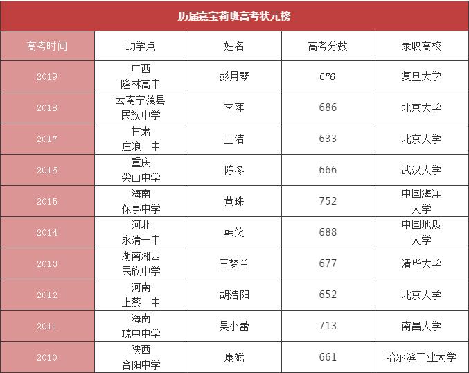 与此同时,本届嘉宝莉班共诞生4名理科状元,分别有湖南城步一中嘉宝莉班戴茜、广西隆林高中嘉宝莉班彭月琴、广西三江民族高中嘉宝莉班杨杰、江西广昌县一中嘉宝莉班曾刘煜。其中,广西隆林高中嘉宝莉班彭月琴,以本届嘉宝莉班最高分676分勇夺隆林县理科状元,被复旦大学录取。湖南城步一中嘉宝莉班学生戴茜,以654分夺得县理科状元,被复旦大学录取。