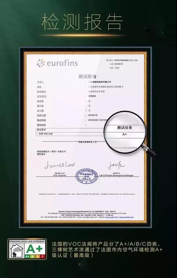 在涂料行业,法国A+认证已经不再陌生,它是法国VOC标签中环保等级最高的标志,并俨然成为中国艺术涂料产品环保认证的“标配”。根据三棵树的介绍,法国VOC标签是室内建筑进入法国市场强制使用的环保标签,根据国际标准ISO-16000室内空气的技术规定来检测,模拟人们实际居住的室内环境,通过专业精密仪器持续28天检测涂刷后空间内的空气质量,根据空气中总挥发性有机化合物的浓度及另外十种常见的对人体有危害的有机化合物浓度对产品评级。