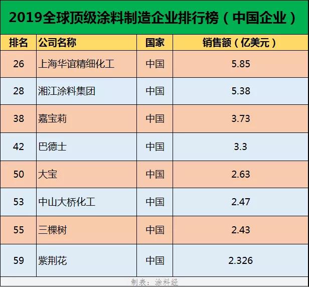 本次2019“全球顶级涂料排行榜”,同时上榜的还有其他7家中国企业,它们分别是上海华谊精细化工(第26位,5.85亿美元)、湘江涂料集团(第28位,5.38亿美元)、巴德士(第42位,3.3亿美元)、大宝(第50位,2.63亿美元)、中山大桥化工(第53位,2.47亿美元)、三棵树(第55位,2.43亿美元)、紫荆花(第59位,2.36亿美元)。