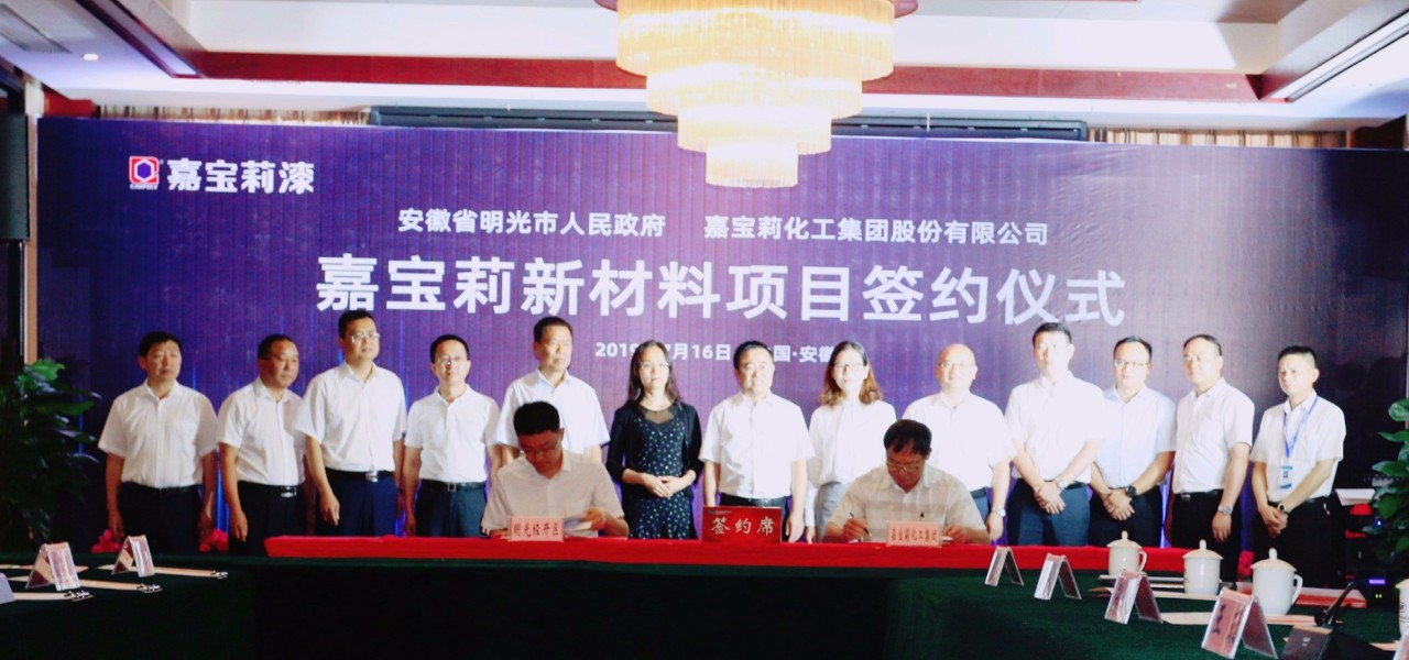 2019年7月16日,嘉宝莉化工集团股份有限公司与安徽明光经济开发区管理委员会成功签约,嘉宝莉投资新建年产50万吨新型建材(含涂料)生产及配套项目正式落户安徽明光市化工集中区。该项目总投资12.6亿元,建设年产“50万吨厚浆涂料、乳胶漆、多彩漆、干粉涂料等”,项目总用地约400亩,其中一期计划用地约220亩。