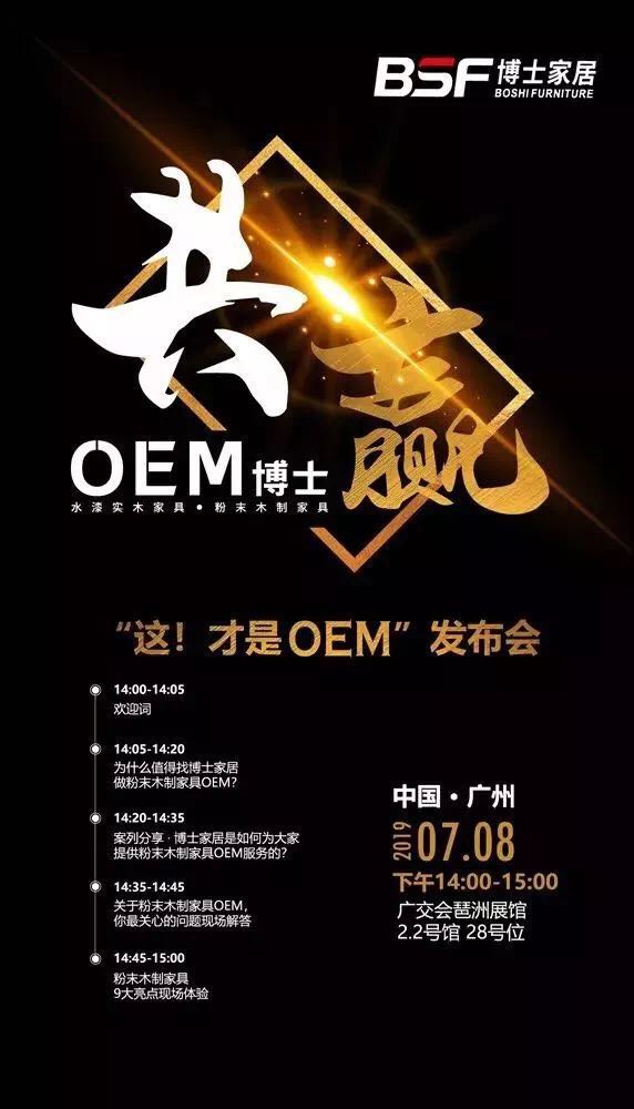 其次,7月8日下午14:00-15:00,位于广交会琵洲展馆2.2号馆的28号展位“巴德士木器粉末涂料馆”将举行“这!才是OEM”发布会。据了解,在这场发布会上,这些大家最想了解的、最关心的问题将现场专家的最专业、最详细的解答,具体包括: