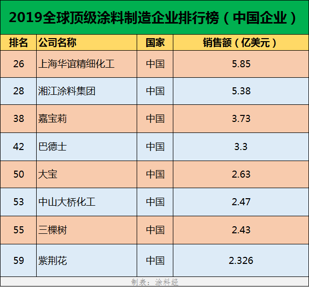 同时入围2019年“全球顶级涂料排行榜”的还包括其他5家中国涂料企业,它们分别是上海华谊精细化工(第26位,5.85亿美元)、湘江涂料集团(第28位,5.38亿美元)、嘉宝莉(第38位,3.73亿美元)、大宝(第50位,2.63亿美元)、中山大桥化工(第53位,2.47亿美元)、三棵树(第55位,2.43亿美元)、紫荆花(第59位,2.36亿美元)。