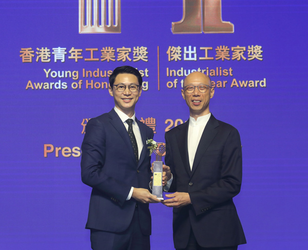 叶氏化工企业发展总裁及高层领导团队成员叶钧先生(左)从署理政务司司长黄锦星先生(右)手上接过奖项