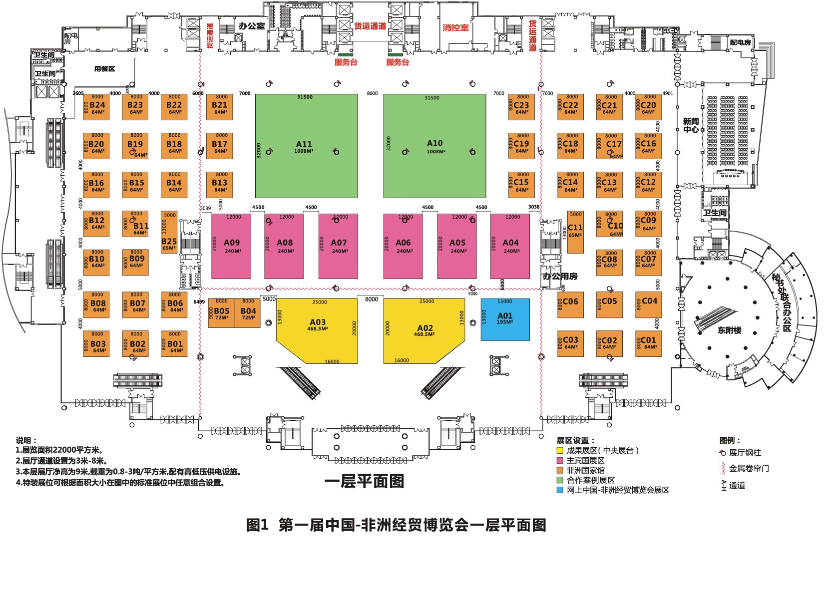 本届博览会设置馆内展区7个,室外展区1个,分别为中非合作成果展区、非洲国家展区、合作方案及案例展区、中国地方展区、网上“中非博览会”展示区,以及3个企业展区(中非合作企业展区、非洲商品展区和室外展区)。