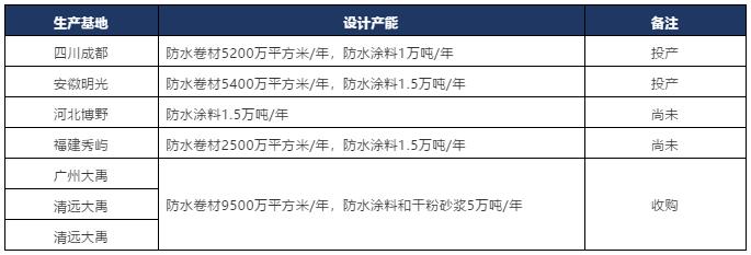 三年时间不到即完成在华南、西南、华北、华东、东南区域的战略布局,总设计年产防水卷材2.26亿平米,年产防水涂料10.5万吨,动作之快不可谓不迅速。