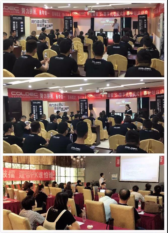 6月13日,荷兰蔻帝618年中大促“泰安·泰兴·临沂·岳阳·永州·湘潭·株洲”七城联动活动正式启动,荷兰蔻帝中国区营销总监带领销售团队、推广团队、活动团队集聚启动会现场,如出山的猛虎,疾驰的战狼一样,以“S+尊享倍增模式”为绝佳的战斗武器,全面打响618年中大战。