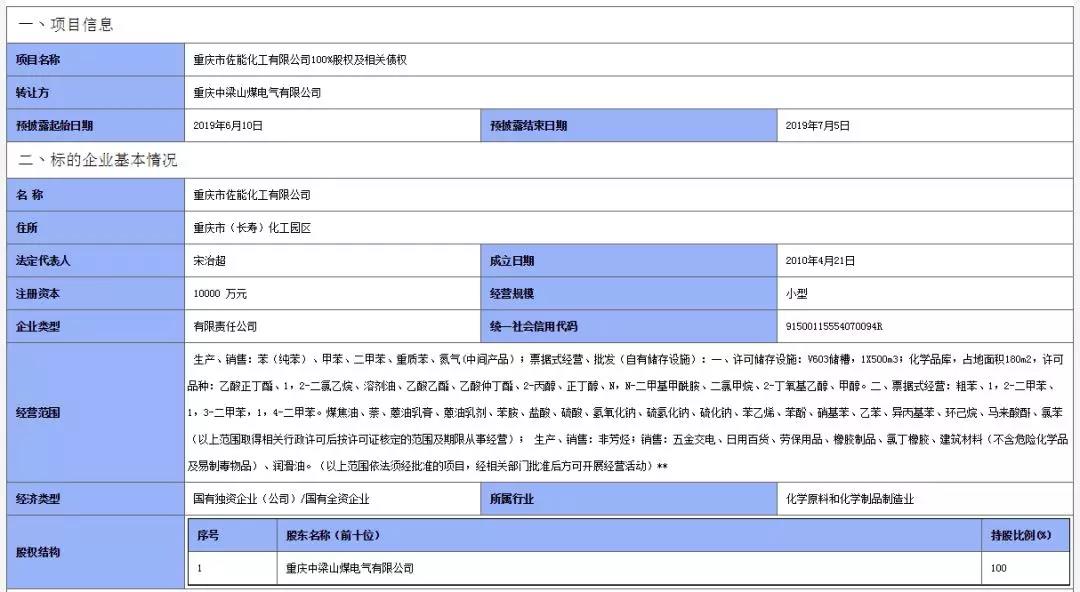 6月10日,《涂料经》从重庆联交所了解到,重庆市佐能化工有限公司100%股权及相关债权在重庆联交所挂出转让预披露信息,预披露结束日期为2019年7月5日。