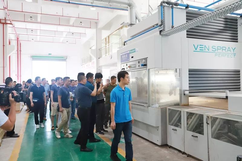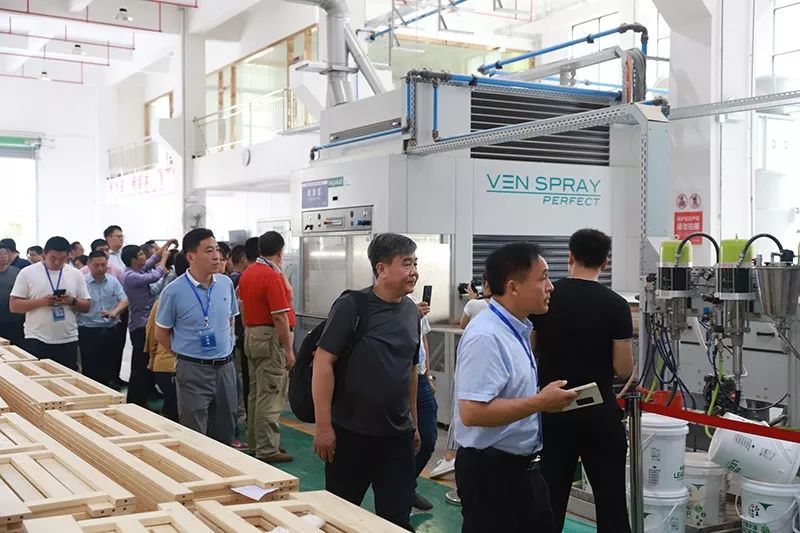 来宾们来到国内首屈一指的博士家居水漆与粉末涂料集中喷涂基地,走进近50000平米的涂装车间,近距离参观了德国VENJAKOB往复式自动化喷涂线、意大利FINITURE全自动化吊线静电旋杯喷涂线与粉末木制家具涂装生产线,亲眼见证了全球领先水漆和粉末涂料环保涂装设备的惊艳效果,领略了“技术可共享,生产可参观,环保看得见”的全套新型水漆涂装模式与“方案可复制,涂装可批量,品质国际化”的全套新型粉末涂装模式的完美表现。