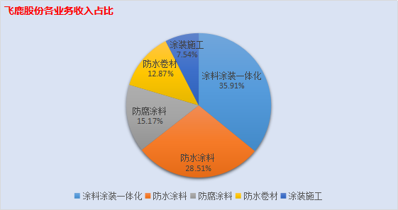从业务结构来看,“涂料涂装一体化”、“防水涂料”是飞鹿股份营业收入的主要来源。具体而言, “涂料涂装一体化”营业收入为1.4亿,营收占比为35.91%。“防水涂料”营业收入为1.1亿,营收占比为28.51%。“防腐涂料”营业收入为5804.6万,营收占比为15.17%。