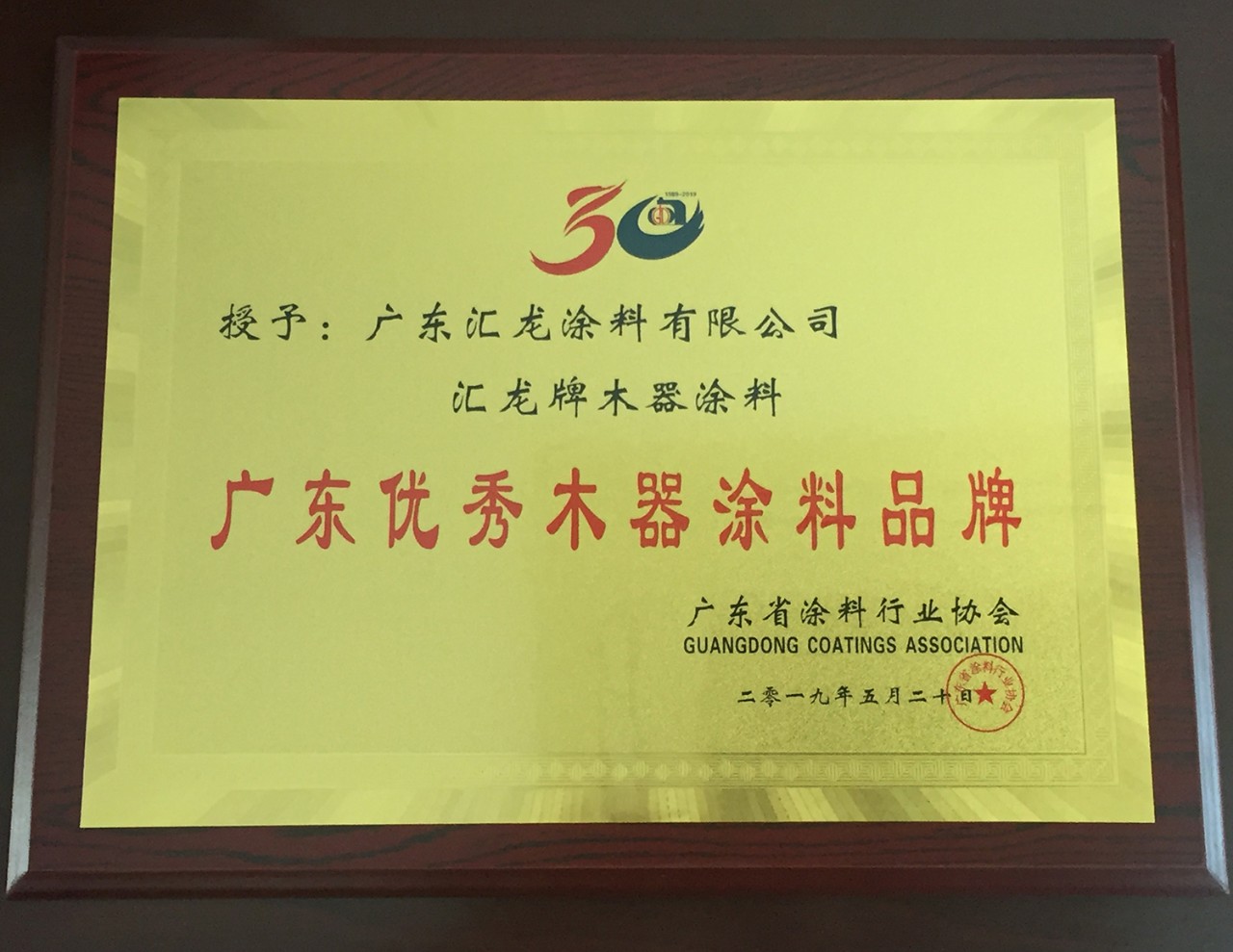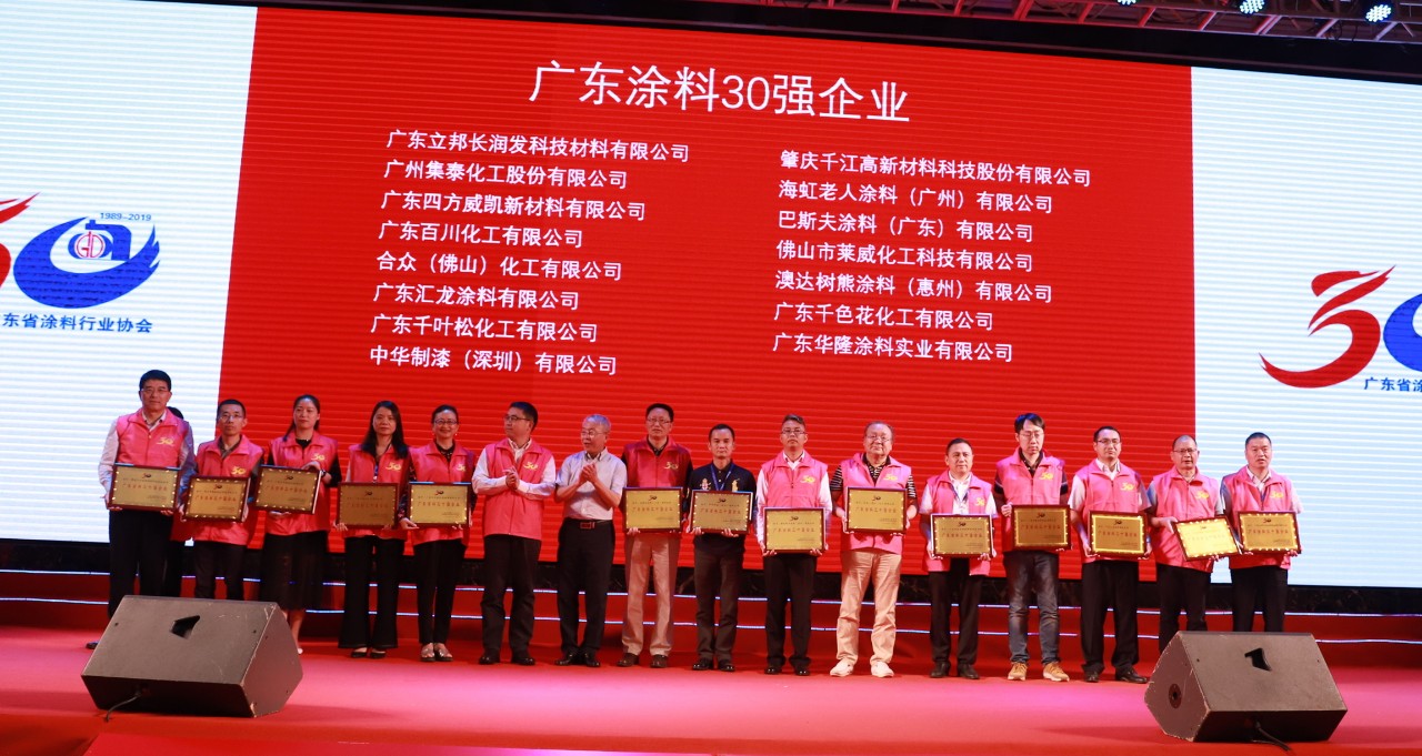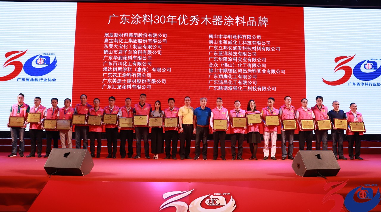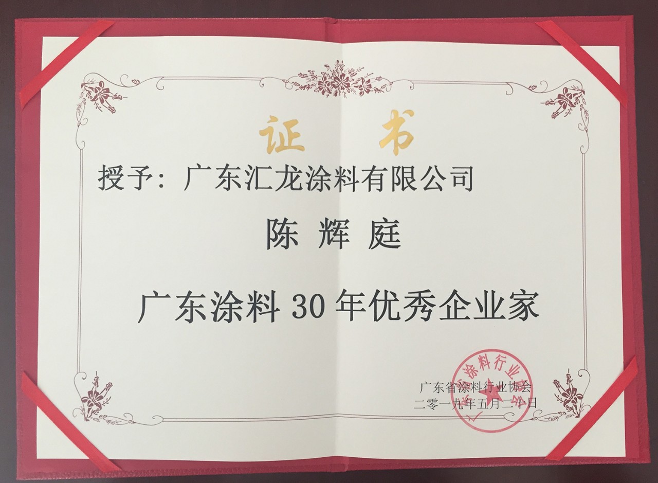 5月19日-5月20日,以“同心同德 共创共享”为主题的广东省涂料行业协会30周年庆典暨2019广东涂料产业发展大会在广东鹤山隆重举行。政府相关领导及来自全国涂料上下游行业的精英相聚,共同见证辉煌时刻。在表彰大会上,汇龙涂料获得“广东涂料30强企业”、“广东涂料30年优秀木器涂料品牌”荣誉。董事长陈辉庭被授予“广东涂料30年优秀企业家”称号。