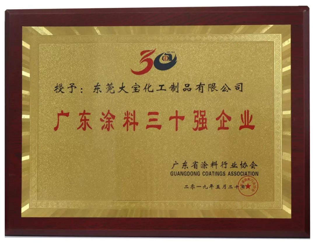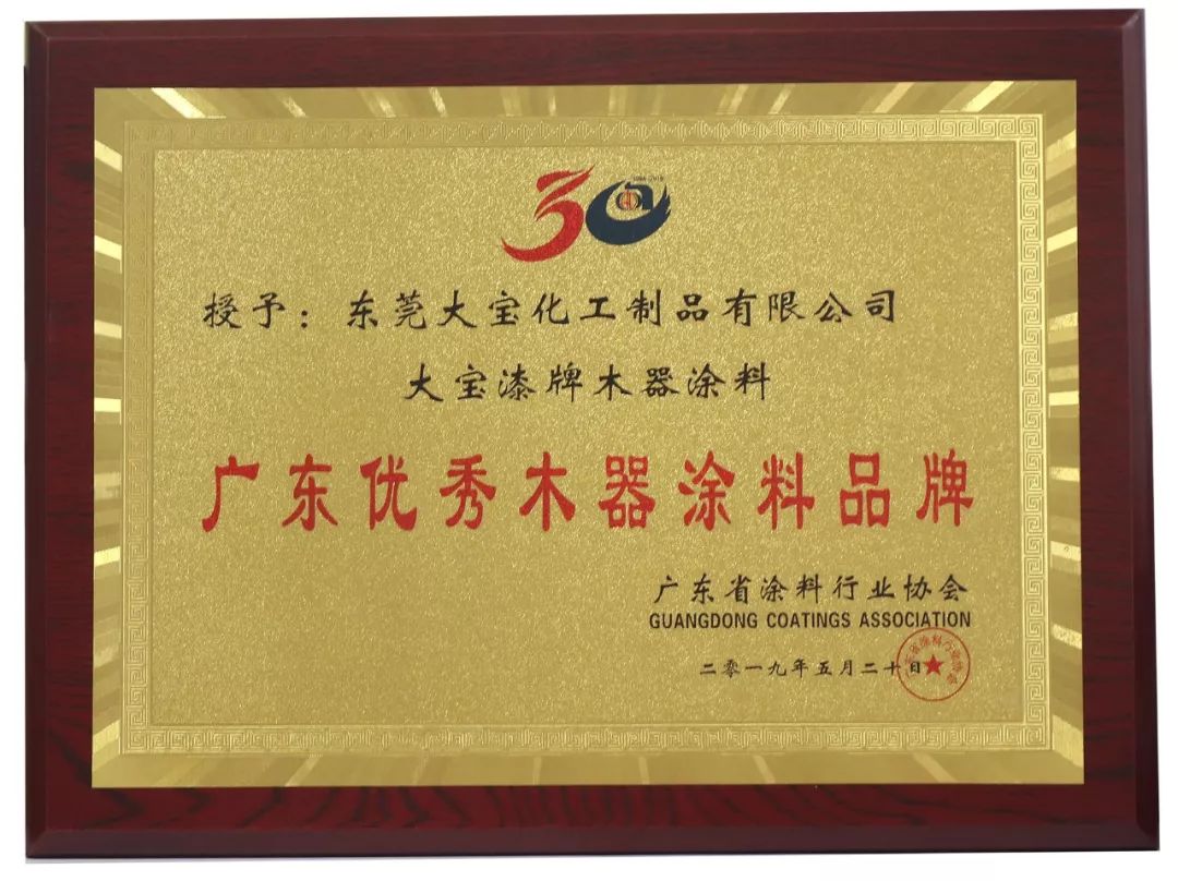 因为始终对品质及服务的坚持,大宝漆已先后获得了 “中国涂料工业百年百强企业”、“全国质量诚信标杆典型企业”、“国家高新技术企业”、“广东省名牌产品”等。