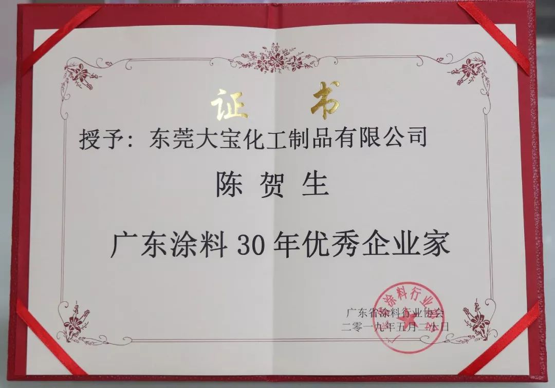 坚守品质,才能获得肯定。此次在广东省涂料行业协会成立三十周年行业表彰大会上,凭借对质量的严格把控和对涂料的专业专注,东莞大宝化工获得“广东涂料30强企业”,大宝漆被授予“优秀木器涂料品牌”荣誉。大宝国际董事长陈贺生获得“优秀企业家”称号。这是广涂协对大宝漆多年来在涂料行业的突出贡献的肯定和认可。
