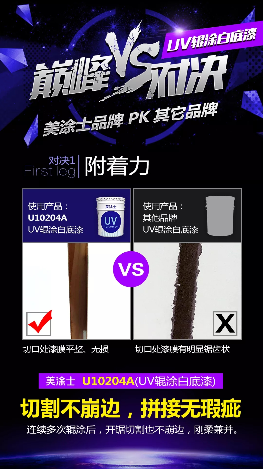 而针对现有技术的不足,在UV辊涂涂装中,板材切割总是崩边,严重影响表面效果的行业痛点,以及如何提升施工效率的难点,美涂士家具漆推出U10204A UV辊涂白底漆新品。