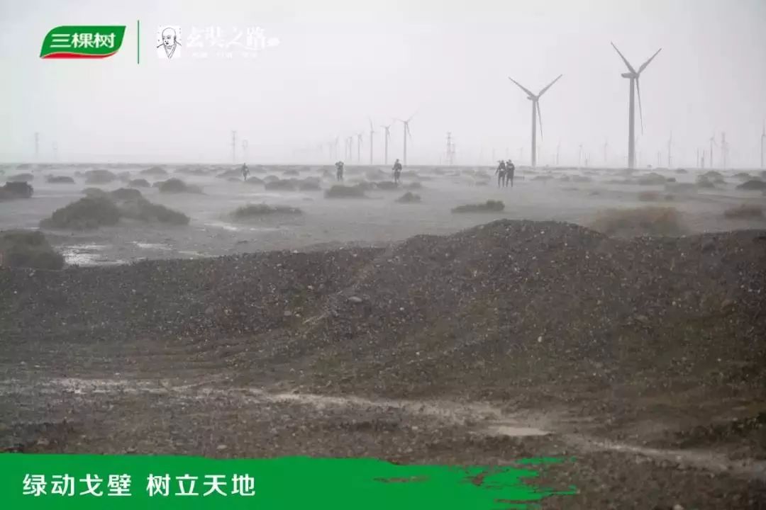 也在这天,三棵树人遇到了5级沙尘暴,大风中卷积着泥沙,铺天盖地笼罩着整个戈壁,他们在寸步难行的环境下逆风前行,用无畏的心迎接风暴。