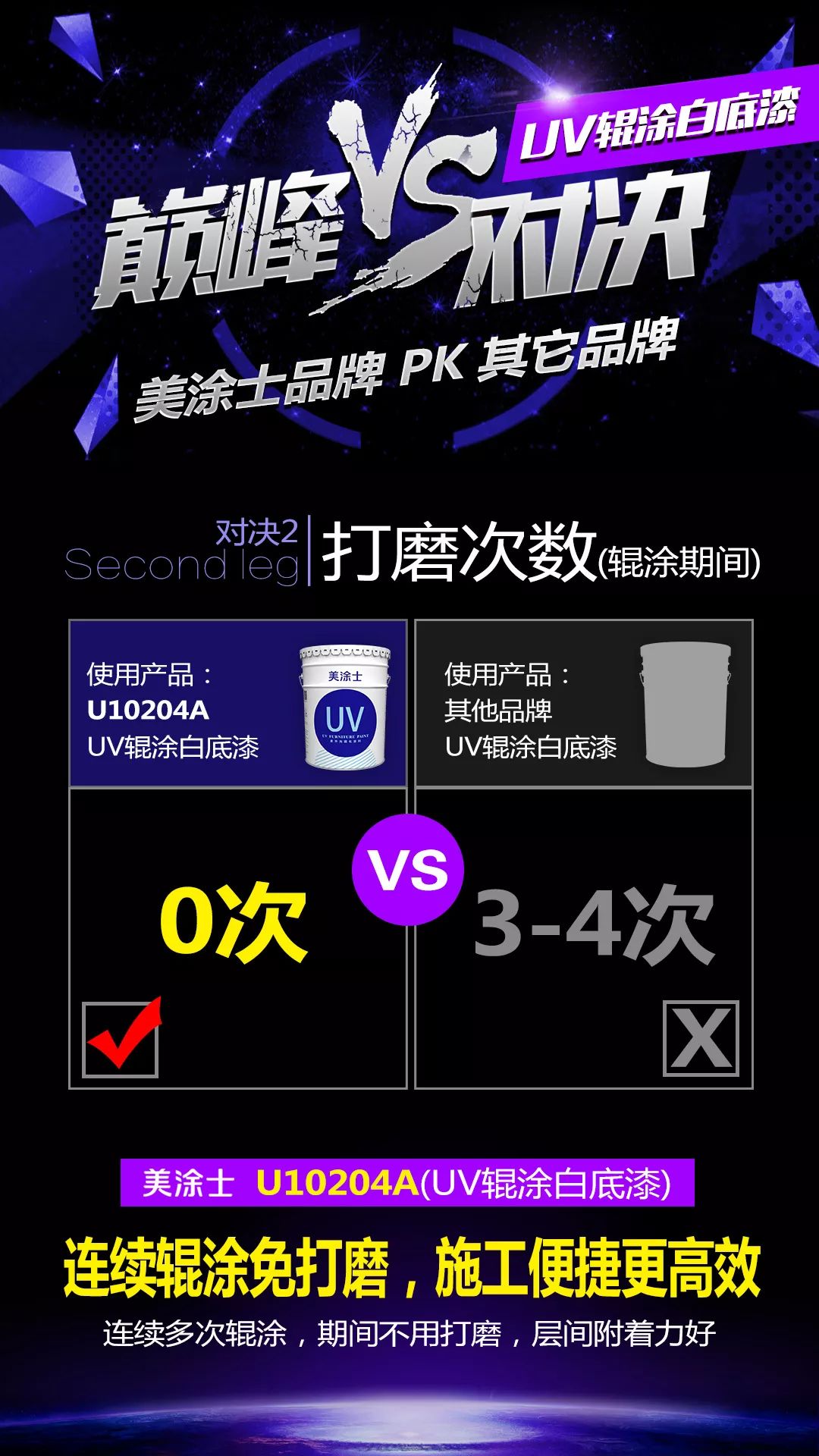在做UV辊涂白底时,为了避免出现附着力差的问题,通常辊涂两遍就必须打磨一次,整个流程较为繁琐。而U10204A UV辊涂白底漆,能够连续辊涂六至七遍都不用打磨,施工简易,不但大大提升了施工效率,而且层间附着力好,从根源上解决了砂光不到位导致附着力差的问题。
