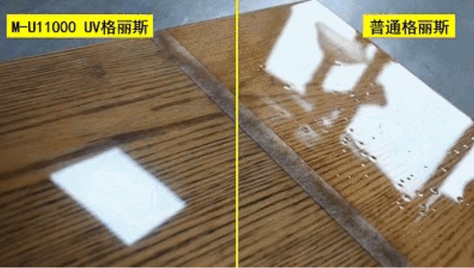 使用M-U11000 UV格丽斯的涂装工艺:基材→擦涂UV格丽斯→固化→打磨→UV底漆→固化→打磨→面漆(UV/水性/PU/NC)