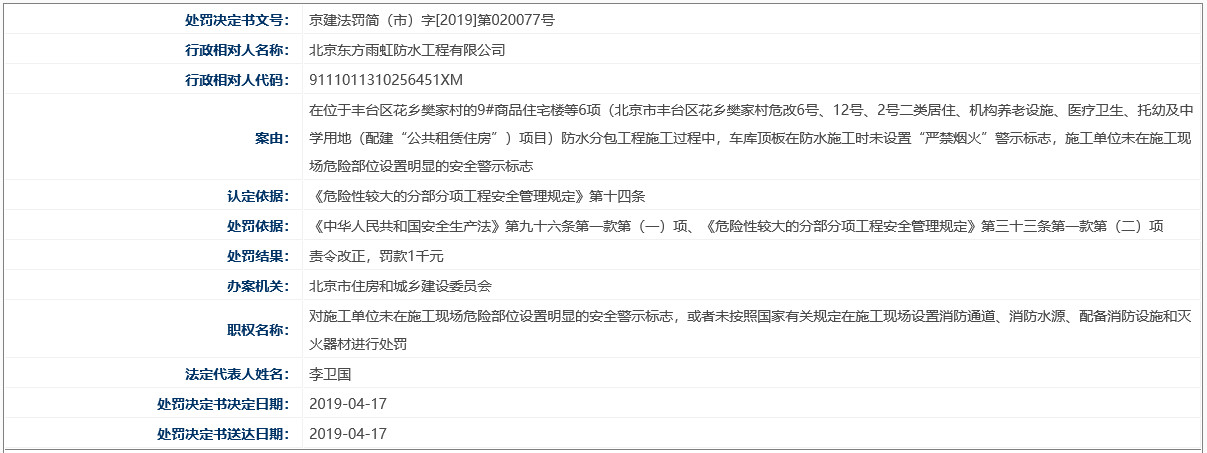 来看一下具体情况。近日,北京市住房北京市住房和城乡建设委员会网站发布行政处罚决定书显示,雨虹工程因对施工单位未在施工现场危险部位设置明显的安全警示标志,违反了《中华人民共和国安全生产法》第九十六条第一款第(一)项、《危险性较大的分部分项工程安全管理规定》第三十三条第一款第(二)项,被罚款1千元,责令改正。