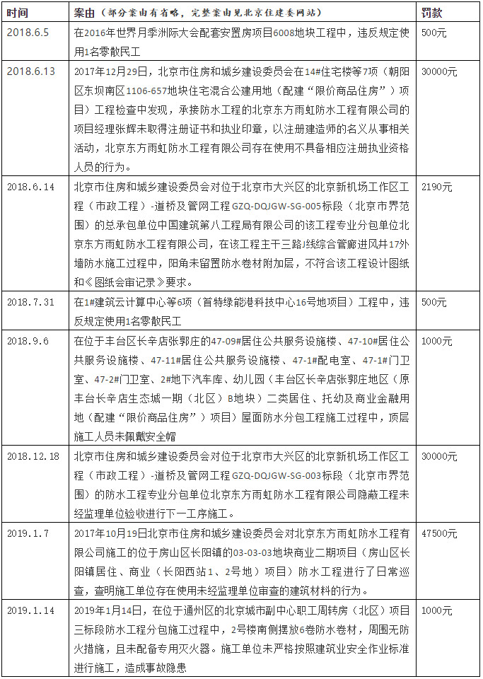 《涂料经》注意到,这并不是雨虹工程第一次施工“闯红灯”,在今年1月份,雨虹工程因在位于通州区的北京城市副中心职工周转房(北区)项目三标段防水工程分包施工过程中,未严格按照建筑业安全作业标准进行施工,造成事故隐患的行为而被处以“责令改正,罚款1千元”的处罚。